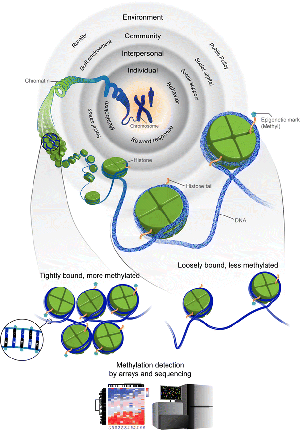 Conceptualizing the exposome and epigenetic processes. The blue strands of DNA are wrapped in a dynamic and functional structure called chromatin. As illustrated in the figure, the DNA is wound around histones. Histone tails receive modifications, or epigenetic marks, that turn on or turn off gene expression. One such modification is methylation, in which a methyl group, represented by the blue pentagon, attaches to the histone tail. DNA is wrapped more tightly around histones that are highly methylated, restricting accessibility of the DNA to be read for gene expression. Methylation of DNA occurs in areas of density in cytosine nucleotides and guanine nucleotides (CpG islands). Epigenetic processes can occur in response to nested levels of exposures depicted at the: individual, interpersonal, community, and environmental levels; each can influence epigenetic modifications independently or jointly. Epigenetic responses may result in more methylation that tightens the chromatin bond “turning off” gene expression; or, such processes may give rise to demethylation, resulting in loosely bound chromatin “turning on” gene expression. Thus, detecting the amount of methylation across the genome or within a particular gene using arrays or with sequencing technologies can provide evidence of epigenetic responses to a set of exposures (Color figure online)