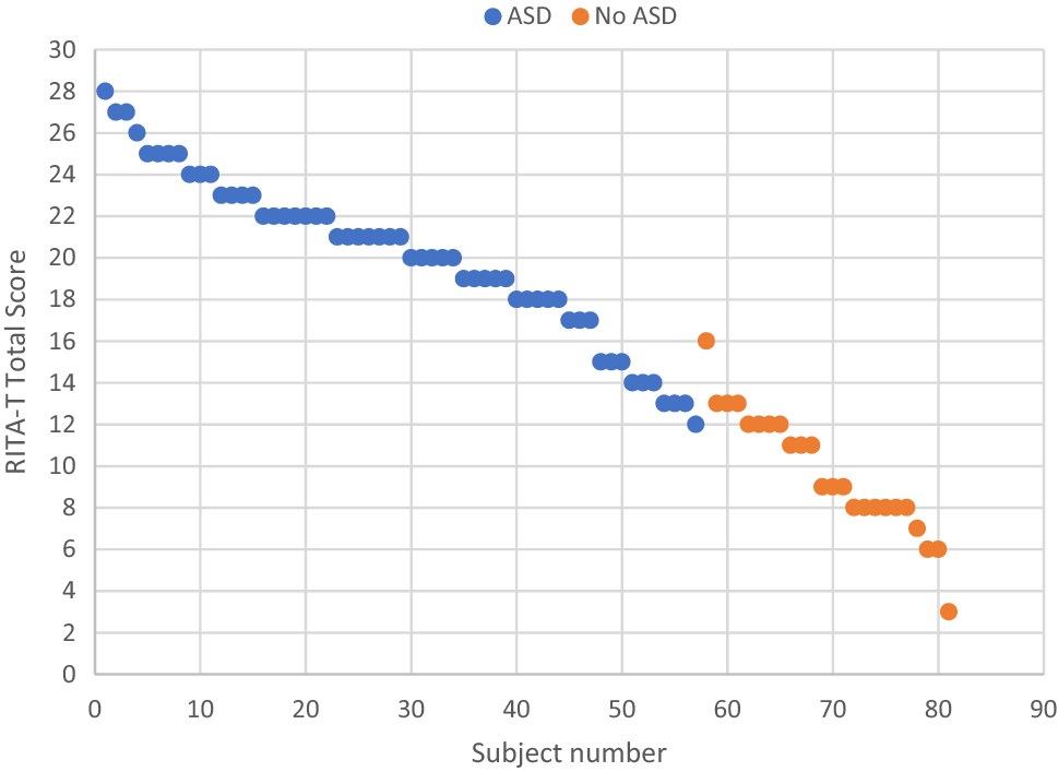 Demographics and test scores were compared between ASD and Non-ASD/DD groups. Percentages were reported for categorical variables, for normally distributed continuous variables, means and standard deviations (SD) were calculated, and medians and interquartile ranges (IQR) were computed for non-normally distributed variables. A Chi-Square test was used to compare percentages between the two groups. For continuous variables, a t-test was performed to compare means of normally distributed variables, and the Wilcoxon rank-sum test was used for comparing non-normally distributed variables between the two groups. An unadjusted logistic regression model was used to assess the relationship between RITA-T score and ASD diagnosis. An alpha level of 0.05 was used to determine statistical significance. Sensitivity, specificity, positive predictive value (PPV), and negative predictive value (NPV) were calculated at different cut points of the RITA-T total score. A scatterplot of RITA-T total scores was plotted by random ID assignment of each patient. The scores were sorted from highest to lowest and plotted by ID and divided into ASD versus Non ASD. Analyses were conducted using SAS 9.4 software (SAS Institute Inc, Cary, NC).