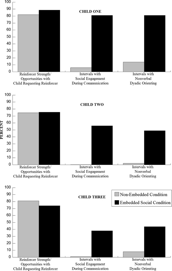 Comparison of reinforcer strength, social engagement during communication, and nonverbal dyadic orienting results in the embedded social and the non-embedded conditions for all children