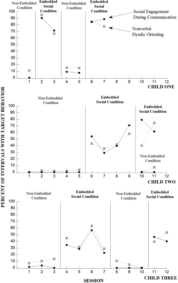 Results are shown in Figs. 1 and 2 for the social engagement measure. In the non-embedded condition, Child One exhibited self-initiated social engagement during communication for a mean of 6% of intervals across all probes. In contrast, during the embedded social condition, his engagement increased to a mean of 81% across probes. In the initial non-embedded probe, Child One exhibited no social engagement during communication. With the introduction of the embedded social interaction condition, the levels of social engagement during communication increased to 90 and 71% of the intervals over the next two probes. The reintroduction of the non-embedded condition was accompanied by a drop in social engagement levels to 9 and 7% of intervals. The final embedded social condition phase resulted in social engagement during communication for 85 and 89% of the intervals.
