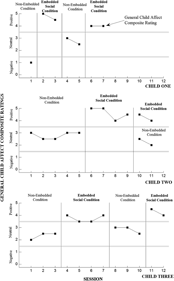 Results of general child affect are shown in Fig. 3. Child One was rated as exhibiting negative or neutral affect (2.2 mean affect rating) across all non-embedded condition probes, and positive affect (4.4 mean rating) across the embedded condition probes. Specifically, in the first non-embedded probe, the child’s composite affect score was scored as 1, indicating that his affect was in the negative range. In the following two embedded social condition probes, the child’s affect rating increased to 5 and 4.5, indicating that his affect was in the positive range. Following the reintroduction of the non-embedded condition, the ratings fell to 3 and 2.5, which was in the neutral range. During the final two embedded condition probes, the composite affect scores were 4 and 4, indicating that affect was in the positive range.