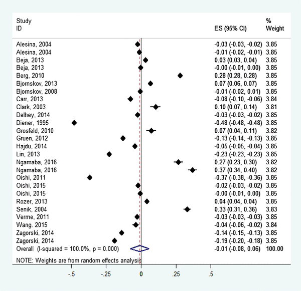 Forest plot displaying meta-analysis of the correlations between income inequality and SWB across 24 independent samples