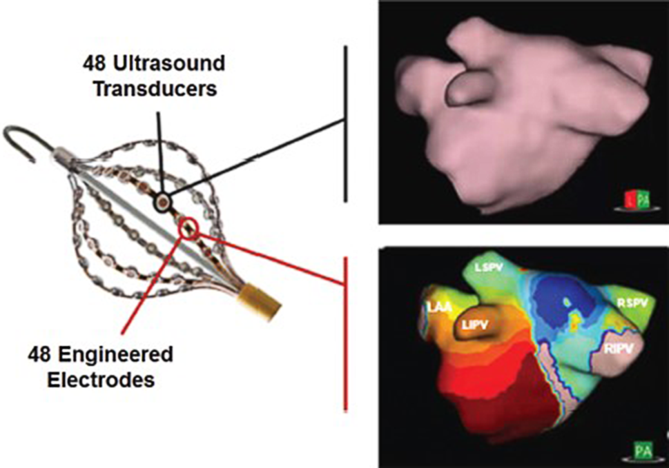 AcQMap catheter. The six splines of the catheter have 48 ultrasound transducers for anatomy reconstruction (upper right panel) and 48 electrodes for recording biopotential signals used to create propagation history maps (lower right panel). This figure was reprinted with permission from [10]
