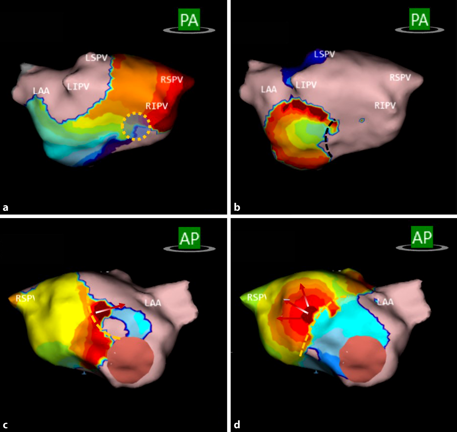 Three activation patterns of interest in patient 21. All panels show propagation-history maps of the left atrium, which use bands of colour to show location and velocity of leading edge of wave front over a set period of time. Red colour indicates leading edge of wave front, with trailing colour bands showing earlier locations. Width of colour bands indicates conduction velocity of wave fronts; wider bands are indicative of fast conduction and narrow bands of slow conduction. a Localised rotational activation (spiralling around a small, confined zone, indicated by dotted yellow circle) in the posterior wall of left atrium (LA). b Focal activation in posterior wall of LA. c, d Localised irregular activation (entry/exit through confined zone, indicated by red arrows) in anterior wall of LA. PA posteroanterior, AP anteroposterior, LAA left atrial appendage, LIPV left inferior pulmonary vein, LSPV left superior pulmonary vein, RIPV right inferior pulmonary vein, RSPV right superior pulmonary vein