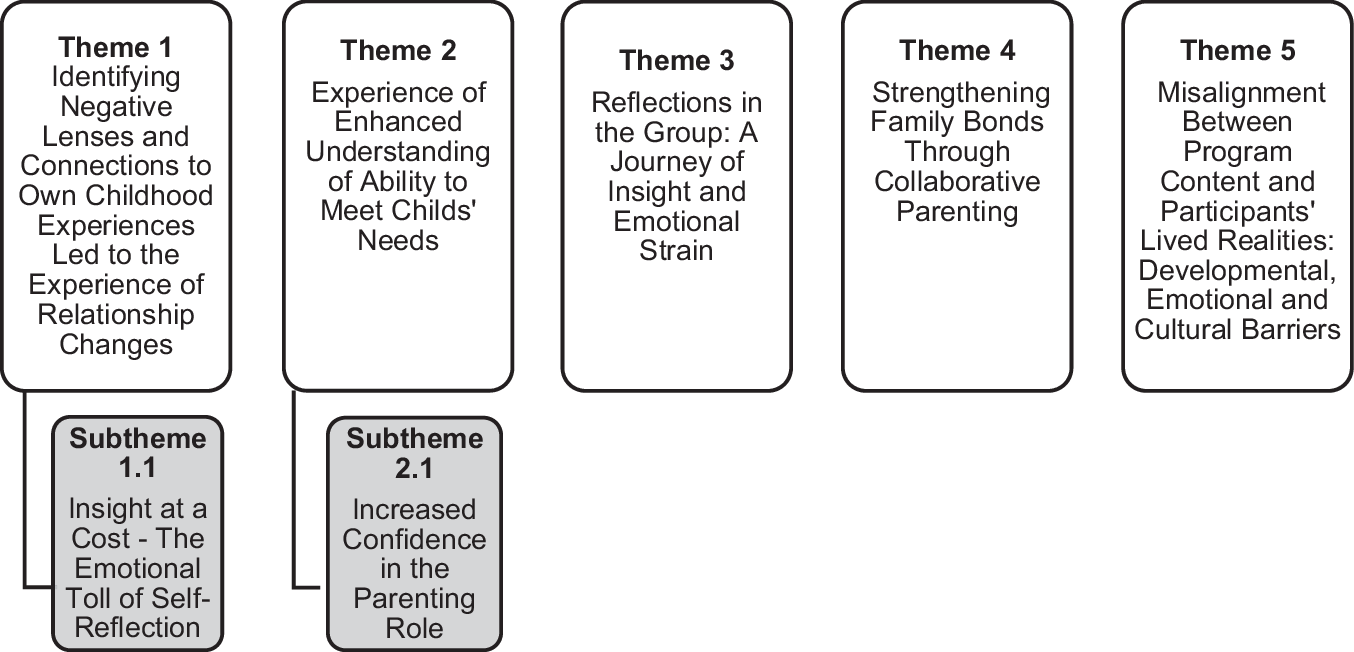 Figure 1 presents our findings from the reflexive thematic analysis of mothers’ accounts of participating in the COSP™ program. Rather than portraying the intervention as uniformly beneficial, the results highlight the emotionally complex and, at times, distressing nature of the experience. While many participants described increased awareness of and new insights into their parenting practices, these shifts often emerged in tandem with moments of emotional strain, ambivalence, and a sense of dissonance between program content and lived experience. Five interrelated themes capture this complexity. Theme 1 explores how the program surfaced painful personal histories. Theme 2 examines heightened attunement to the child alongside increased self-doubt. Theme 3 focuses on vulnerability in the group-based format, Theme 4 captures the benefits of partaking with a partner, and Theme 5 considers contextual and relational constraints on applying program insights. Together, these themes point to the demanding and emotionally layered nature of the reflective work COSP™ elicited.