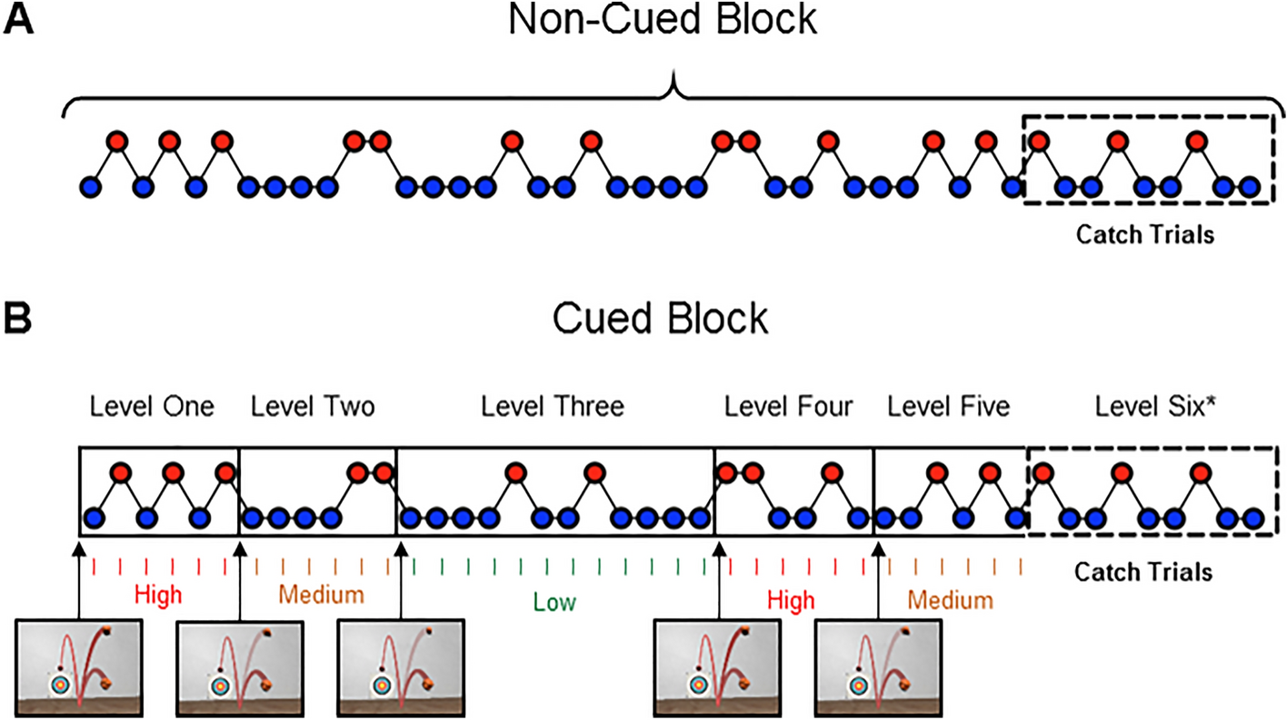 Schematic Illustration of the Experimental Protocol. Participants were presented with a series of balls that bounced with either normal (blue circles) or unexpectedly-high (red circles) levels of elasticity. Though trial order sequences were the same in each condition, Cued trials were separated into six game levels. Upon entering a new game level, participants received projected ‘hawkeye’ cues (see arrows). Each subsequent trial was then preceded by a visual indicator, which stated whether the likelihood of facing a bouncy ball was ‘low’ (17%), ‘medium’ (33%), or ‘high’ (50%) for this level. Conversely, balls in the non-cued condition were presented as one continuous sequence of trials, with no additional visual information. *Note that both blocks ended with nine catch trials that contained no explicit probabilistic cues