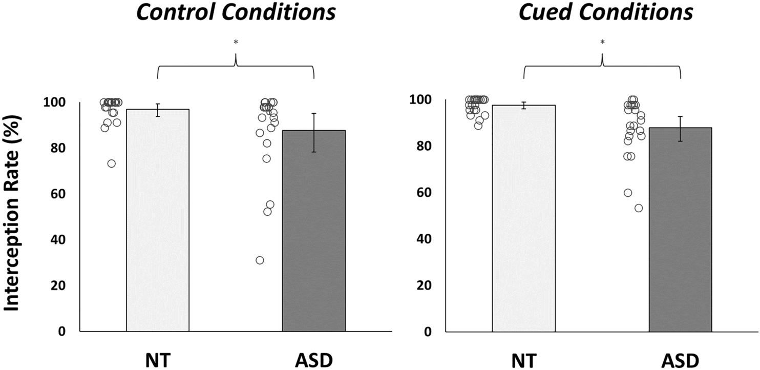 Task Performance. The proportion of balls successfully intercepted in control and cued conditions for each group. NT neurotypical; ASD autism spectrum disorder. Error bars indicate Bias-Corrected Accelerated bootstrapped 95% confidence intervals (based on 10,000 samples). *denotes significant between-group difference (p < .05)