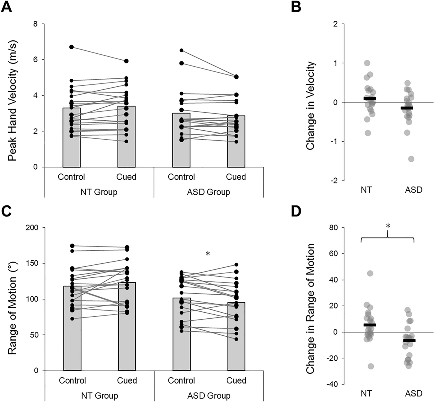 Average peak hand velocities (A) and range of motion (C) during foreswing actions. Between-condition changes are illustrated in panels (B, D). NT neurotypical; ASD autism spectrum disorder; *Denotes significant difference (p < .05)
