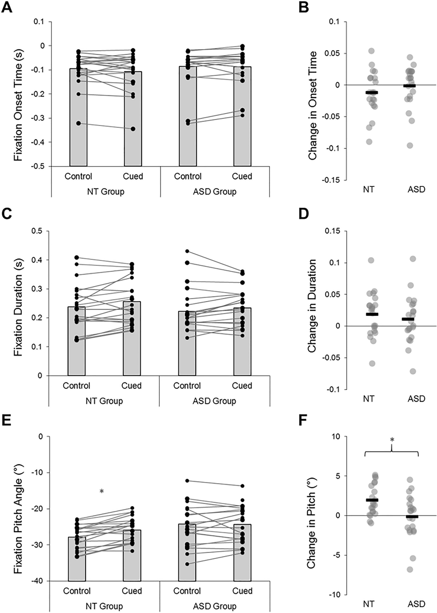 The average onset times (A), durations (C), and pitch angle (E) of predictive bounce fixations. Between-condition changes are illustrated in panels (B, D, and F). NT neurotypical, ASD autism spectrum disorder; *Denotes significant differences (p < .05)