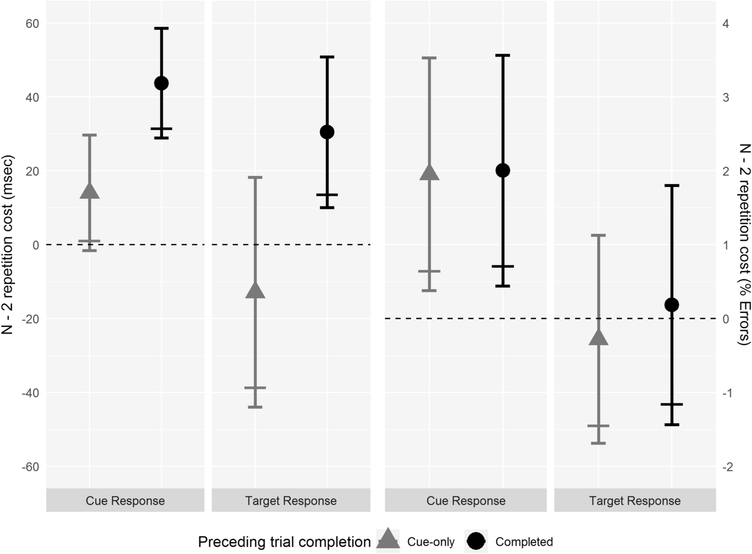 Experiment 4: n − 2 repetition cost for cue and target responses. Left side of the graph is RT data. Right side of the graphs is % error data. Grey triangles show data from completed trials following cue-only trials. Black circles show data from completed trials following completed trials. Narrow error bars above and below means show 95% CIs. Wide error bars below means show lower limit of 90% CI; where this is above the dashed zero line, the one-tailed t test for the presence of an n − 2 repetition cost is significant (p < 0.05)