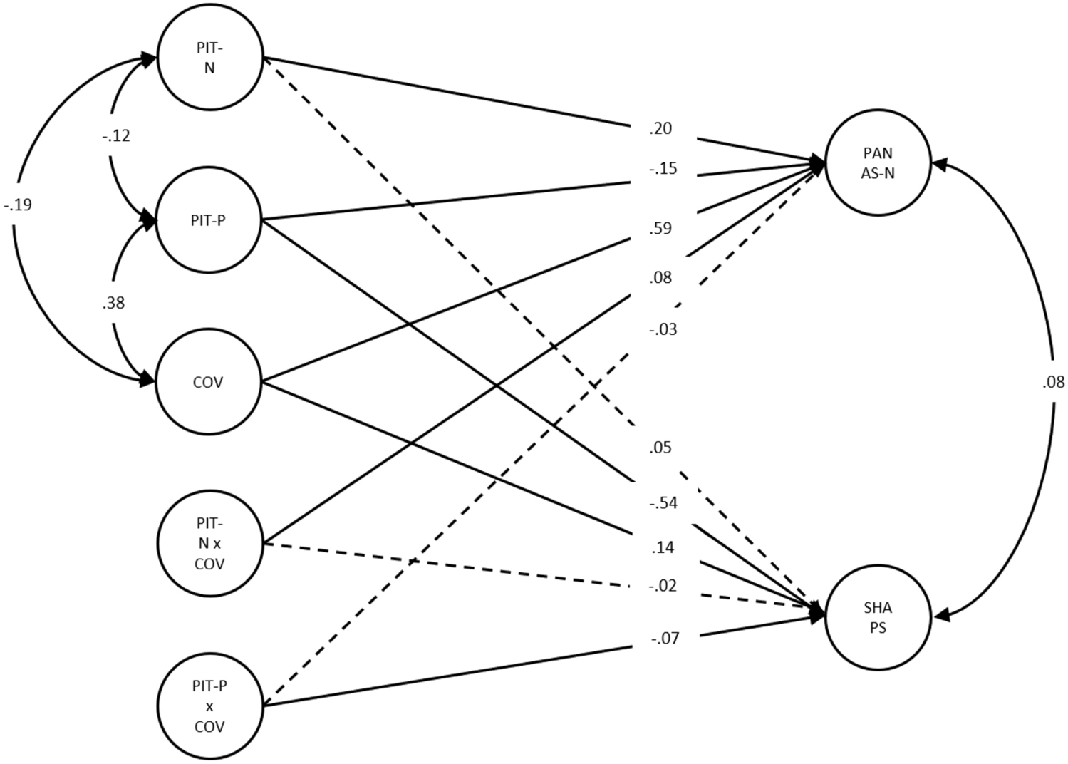 In addition, there were significant main effects of the impact of COVID-19 on negative affect (β(se) = .59(.02), [95% CI] [0.43, 0.57], p < .001) and anhedonia (β(se) = .14(.03), [95% CI] [0.02, 0.08], p < .001). The impact of COVID-19 also significantly correlated with negative future imagery (β(se) = .38(.03), [95% CI] [0.31, 0.46], p < .001) and positive future imagery (β(se) = .19(.03), [95% CI] [− .27, = .13], p < .001). Finally, positive future imagery and negative future imagery were significantly negatively correlated (β(se) = − .12(.04), [95% CI] [− .21, − .02], p = .002).