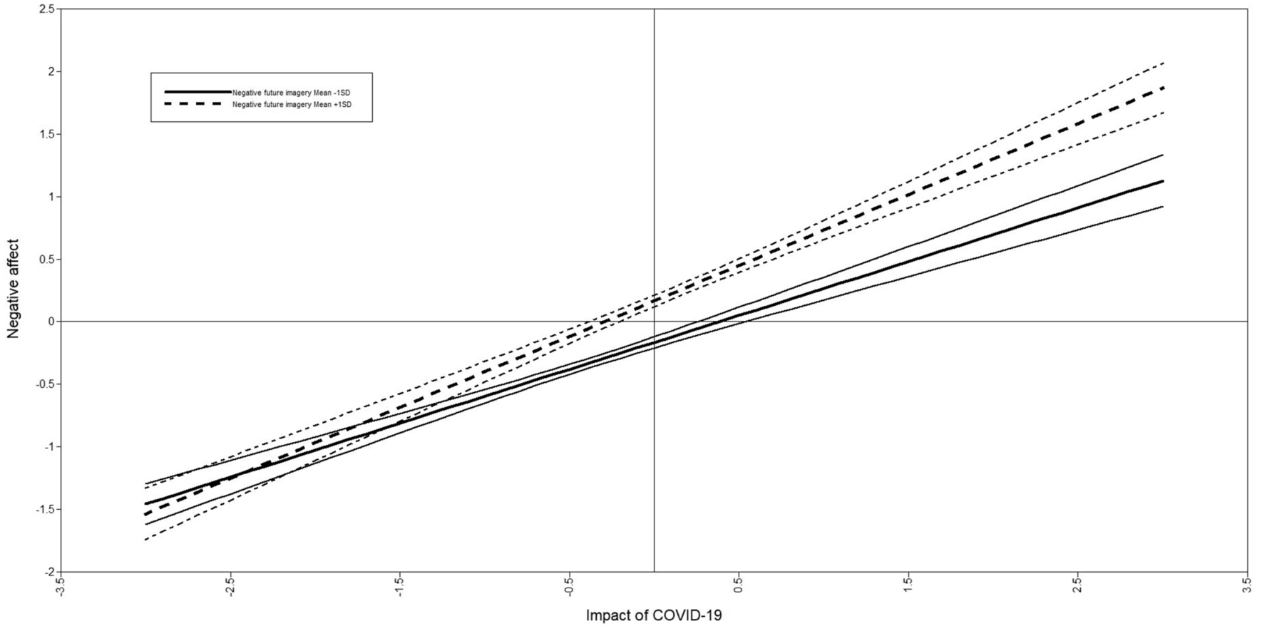 Simple slopes graph for the moderation effect of negative future imagery on the relationship between the of impact of COVID-19 and negative affect. Note. Solid lines indicate low negative future imagery (1SD below the mean), and broken lines indicate high negative future imagery (1SD above the mean). Thinner lines indicate 95% confidence intervals