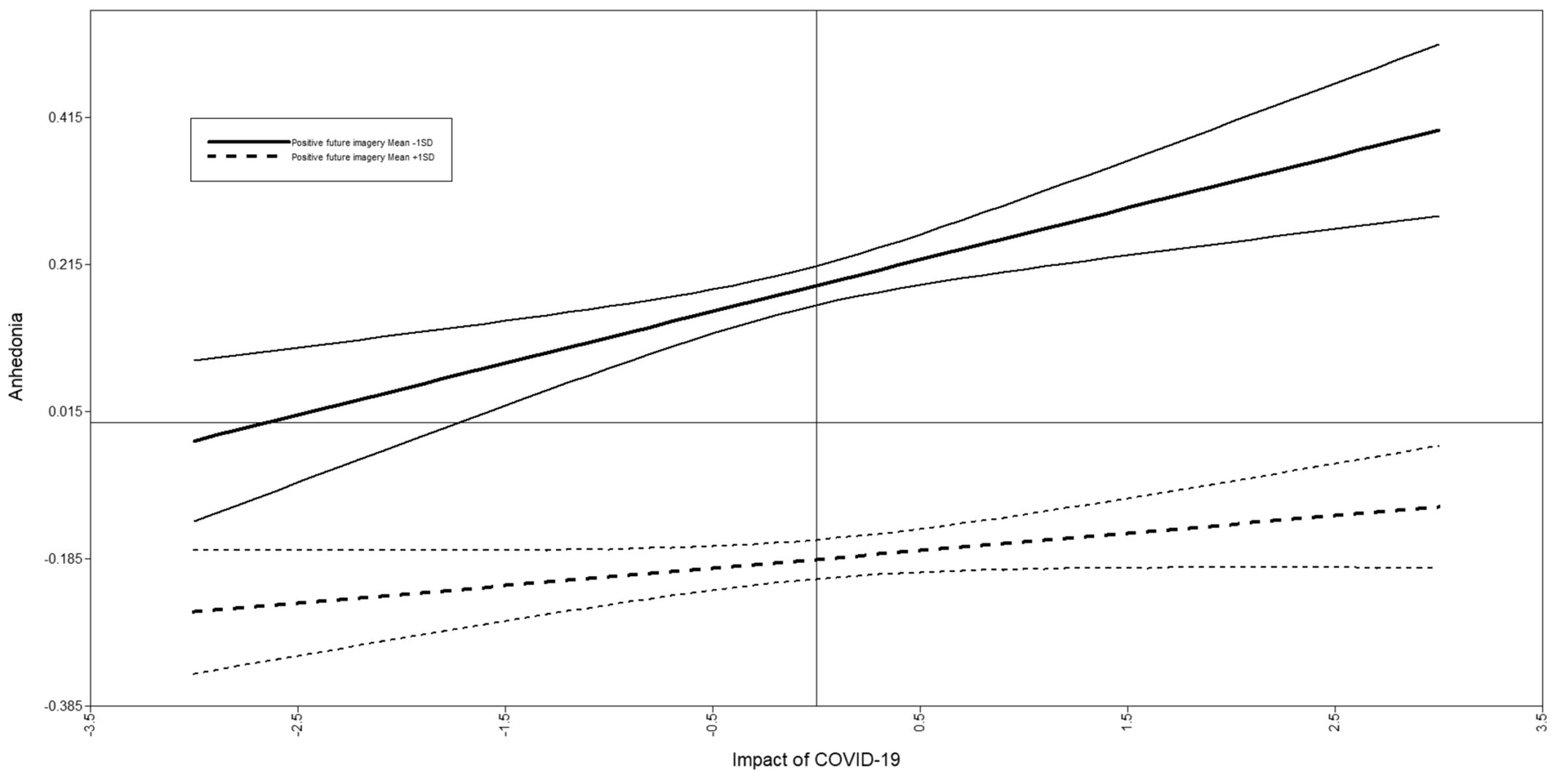 Simple slopes graph for the moderation effect of positive future imagery on the relationship between the of impact of COVID-19 and anhedonia. Note. Solid lines indicate low positive future imagery (1SD below the mean), and broken lines indicate high positive future imagery (1SD above the mean). Thinner lines indicate 95% confidence intervals