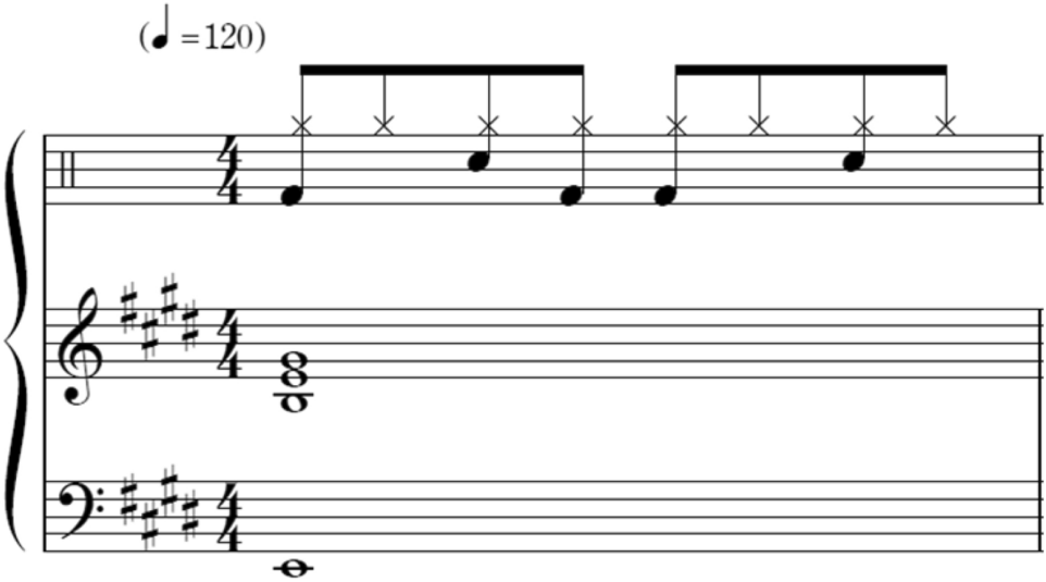 To confirm emotions that were supposed to be induced by chord progressions only, four out of nine stimuli comprised repeating eight-chord progressions played only on the piano, that is, without drum breaks. A chord occurred per 2.4 s, which meant that the piano sound occurred at the first beat of four quarters, at 100 BPM. One stimulus comprised a rhythm pattern played by drums only and a typical rock drum break with a tempo of 120 BPM. The four stimuli comprised the aforementioned four-chord progressions with the aforementioned drum breaks at a tempo of 120 BPM (Fig. 1). The entire RC1 score is shown in Appendix 1. To investigate the influence of chords on groove, I aligned the tempo for comparison between drum breaks with and without chords, that is, RC1–RC4 and R. In these stimuli, the chord played by the piano sounds only at the first beat of the fourth quarter. Each stimulus was 51 s long and included 1 s of fade-out.