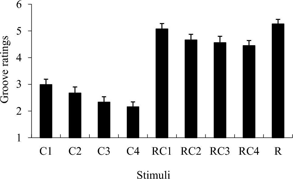 To compare the groove ratings of the drum breaks only (i.e., R in Fig. 2), a t-test (R versus others) was conducted. The ratings of R were significantly higher than that of C1–C4 and RC2–RC4 (ps < 0.01).