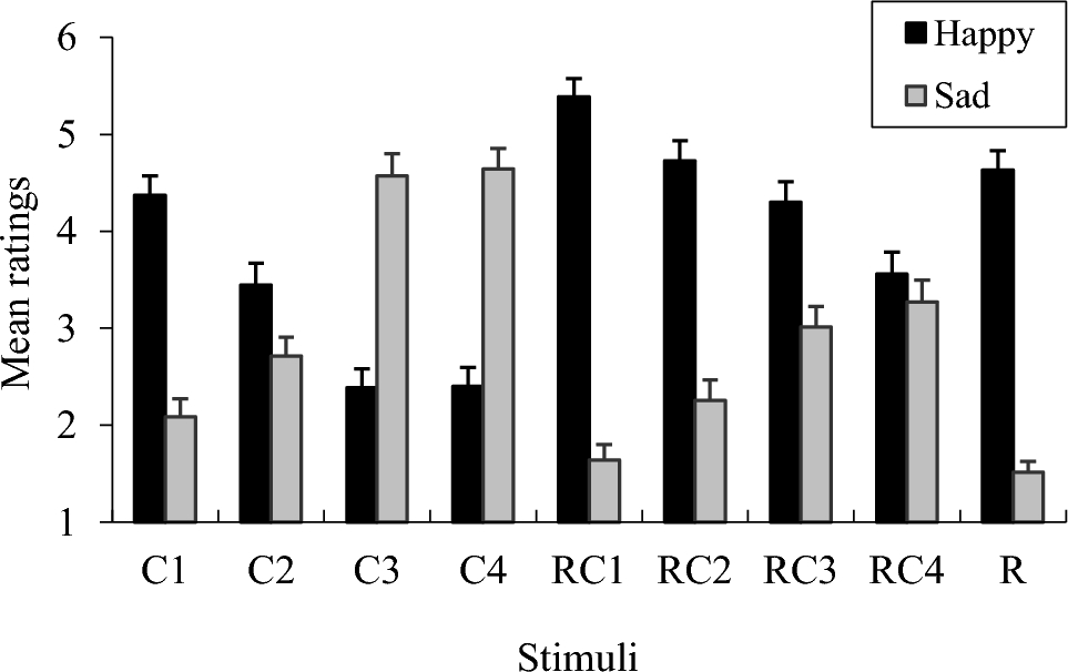 To confirm whether chord progressions altered the induced emotions, I examined the mean ratings of emotions. The mean happiness and sadness ratings for each stimulus are shown in Fig. 3. From C1–C4, happiness ratings decreased, whereas sadness ratings increased. Consequently, the chord progressions used in the present study induced the emotions of the participants as intended. Remarkably, regarding drum patterns alone, the happiness ratings were the same as those of the happiest stimuli, whereas the sadness ratings in drum patterns were low.