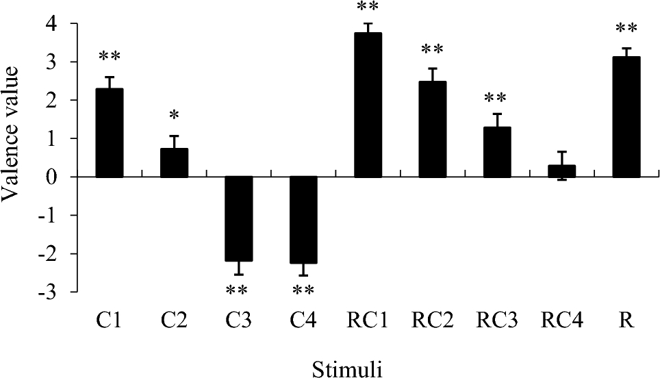 Mean value of valence indices. Error bars represent standard errors. **p < 0.01, *p < 0.05