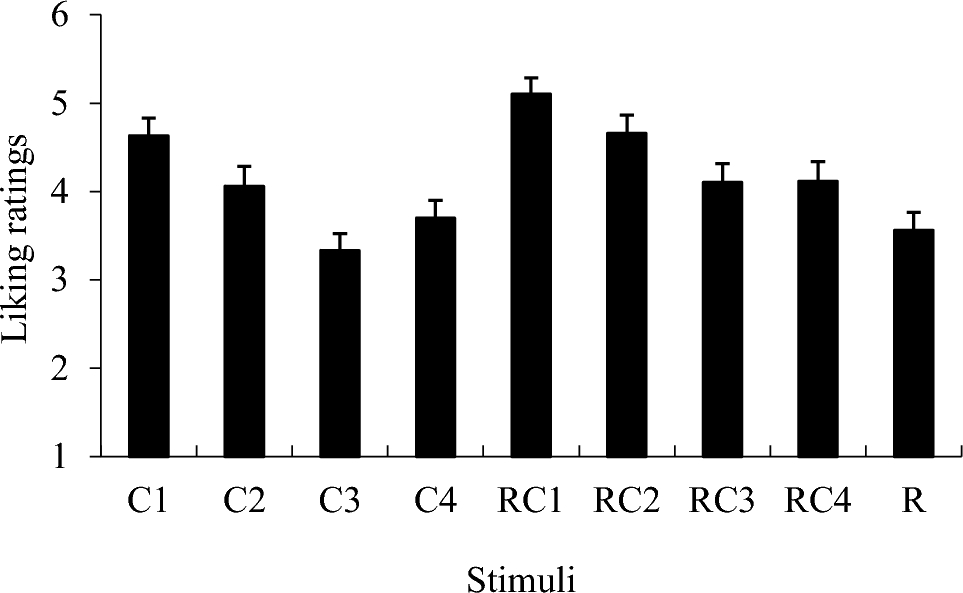 Mean groove ratings. “C” represents chord progression only, “RC” represents chord progression with the rhythmic pattern (drum breaks), and “R” represents the rhythmic pattern (drum breaks) only. For example, RC1 means C1 chord progression with drum breaks. Error bars represent standard errors