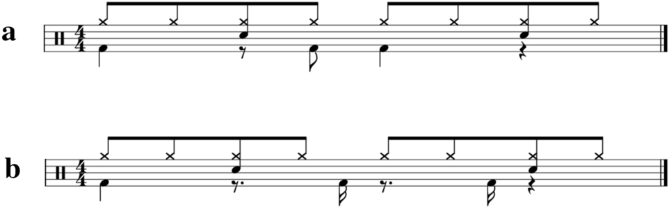 Drum breaks employed in Experiment 2. a and b represent low and medium syncopated drum breaks. These were employed by Etani et al. (2018)
