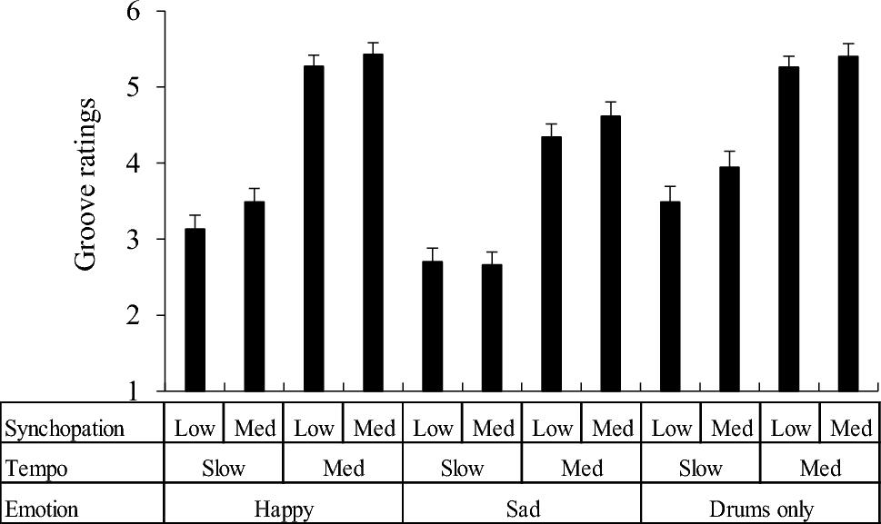 The present study showed that chord progression, tempo, and syncopation had significant impacts on groove, although marginal interactions between chord progress and tempo were observed. Given these results, the influence of emotion induced by chord progressions on groove rarely interacts with rhythmic characteristics, specifically tempo and syncopation. In other words, a slow tempo with a sad musical piece did not make listeners’ perceptions groovier than a fast tempo with a sad musical piece.