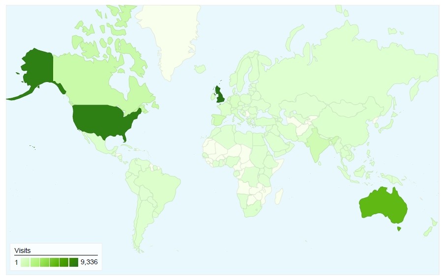 The magnitude and characteristics of traffic on the JFAR website have been tracked using Google Analytics [38] since November 2008. Over this time, there have been over 35,000 visits to the site from 151 different countries (see Figure 1). Most visits are from the UK (27%), followed by the USA (25%) and Australia (16%). The main source of traffic has been via Google searches (48%), followed by direct access (16%), the BioMed Central website (6%), PubMed (3%), Yahoo (3%) and Podiatry Arena (2%). On average, the site receives between 150 and 300 accesses per day.
