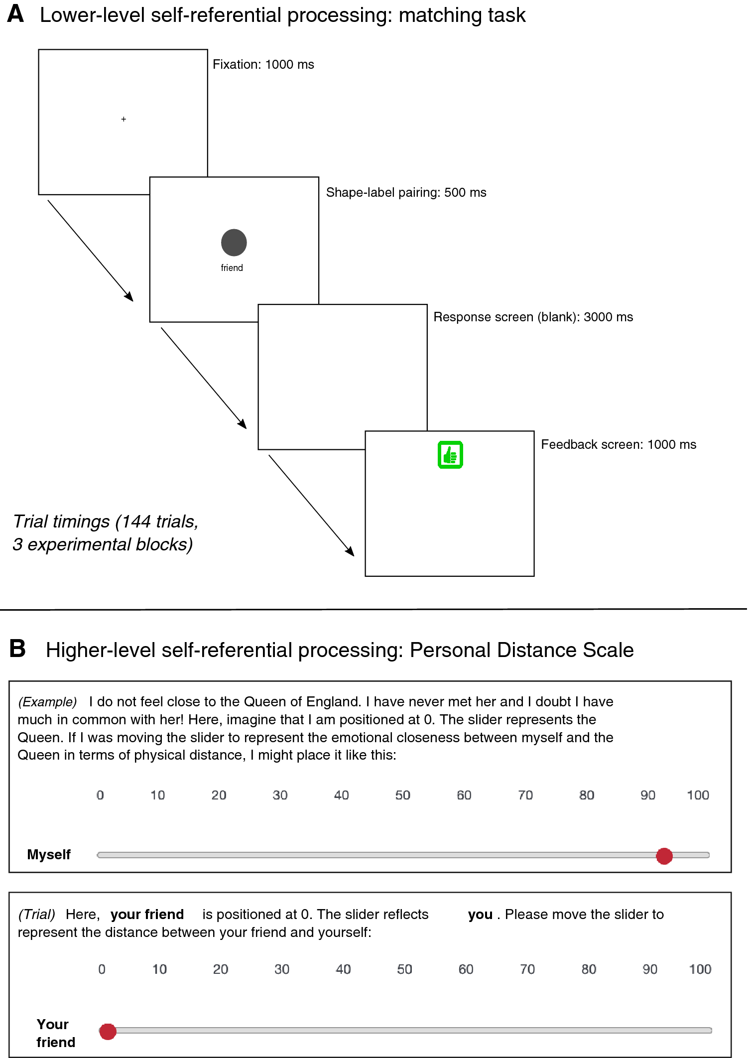 As a second reflection of self-referential processing at a higher, conscious reflective level, participants then completed the Personal Distance Scale (PDS) (Sui & Humphreys, 2015b), wherein they moved sliders on a scale to indicate, by creating physical distance between two people, how close they were emotionally (i.e.: the smaller the value, the closer the individuals). Following several concrete examples (see Fig. 1, Part B), participants indicated, on six trials, their perception of the distance between themselves and a friend (and vice versa), themselves and a stranger (and vice versa), and their friend and a stranger (and vice versa).