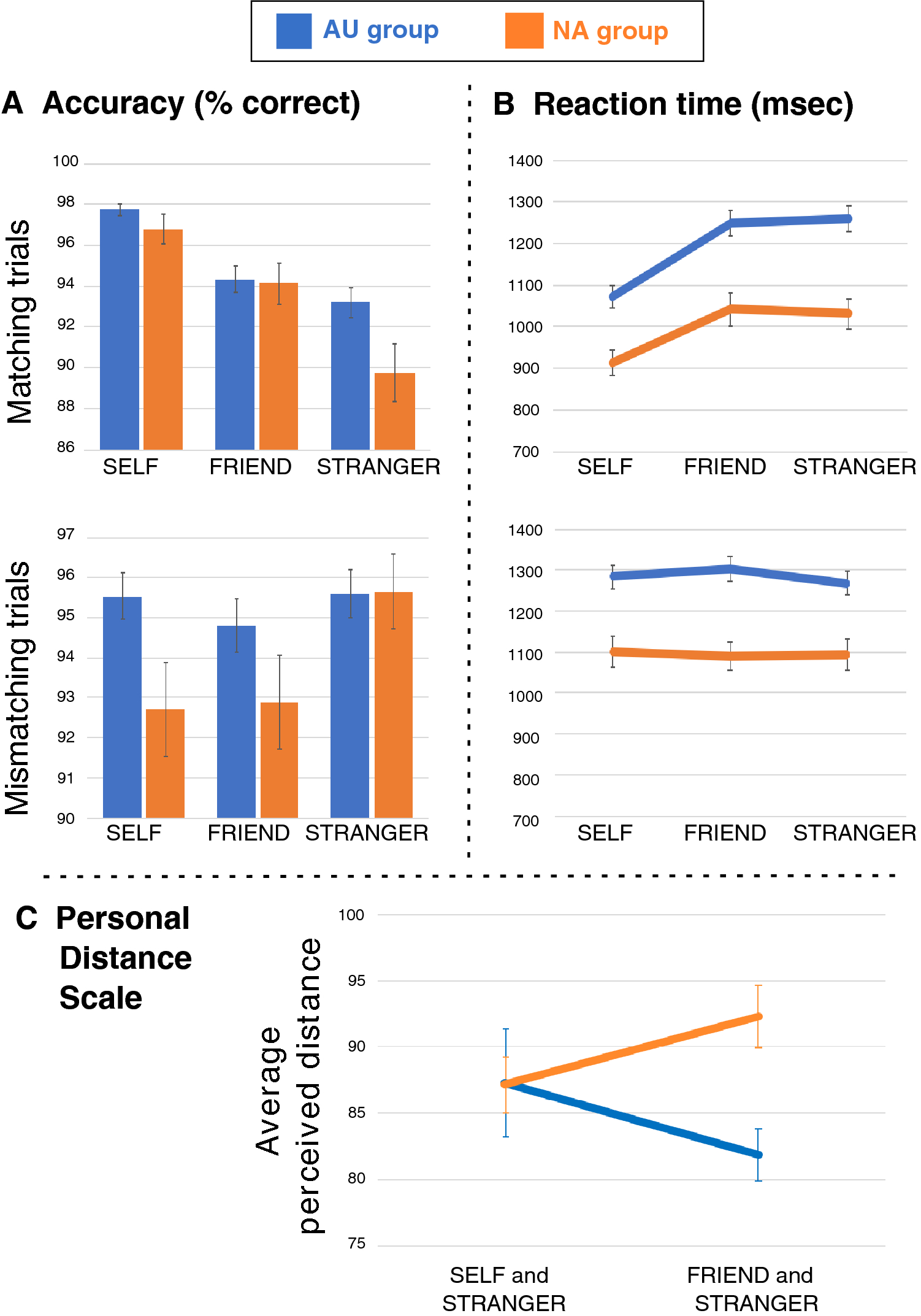 Performance of autistic (AU) and non-autistic (NA) participants in the matching task and Personal Distance Scale. Note. Averages for AU participants are displayed in blue, while those for the NA group are displayed in orange. Error bars reflect standard error. Part A depicts average accuracy (percentage correct) for each condition in matching (top) and mismatching (bottom) trials. Part B depicts average RT in milliseconds for each condition in matching (top) and mismatching (bottom) trials. Part C reflects average distances that participants perceived between themselves and a stranger, and between a stranger and a friend