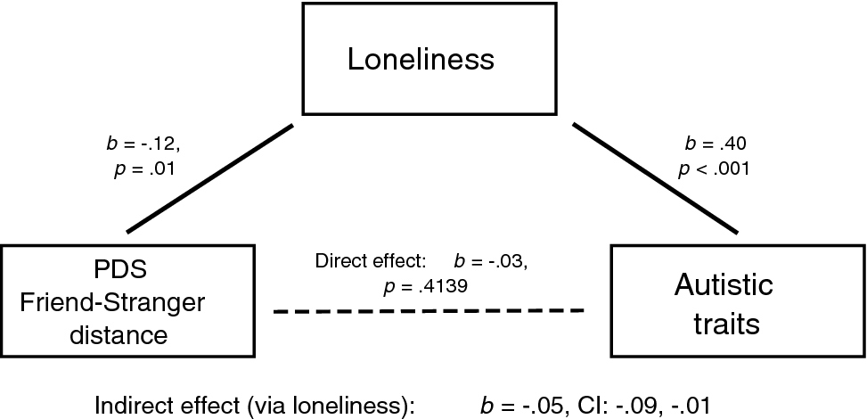 Given the observed relationships between autistic traits, loneliness, and perceived distance between friend and stranger, we conducted a post-hoc mediation analysis with PROCESS (Hayes, 2017) to examine whether, in all participants, the inverse relationship between autistic traits and friend-stranger distance was direct or mediated by loneliness. The relationship was indeed fully mediated by loneliness (see Fig. 3).
