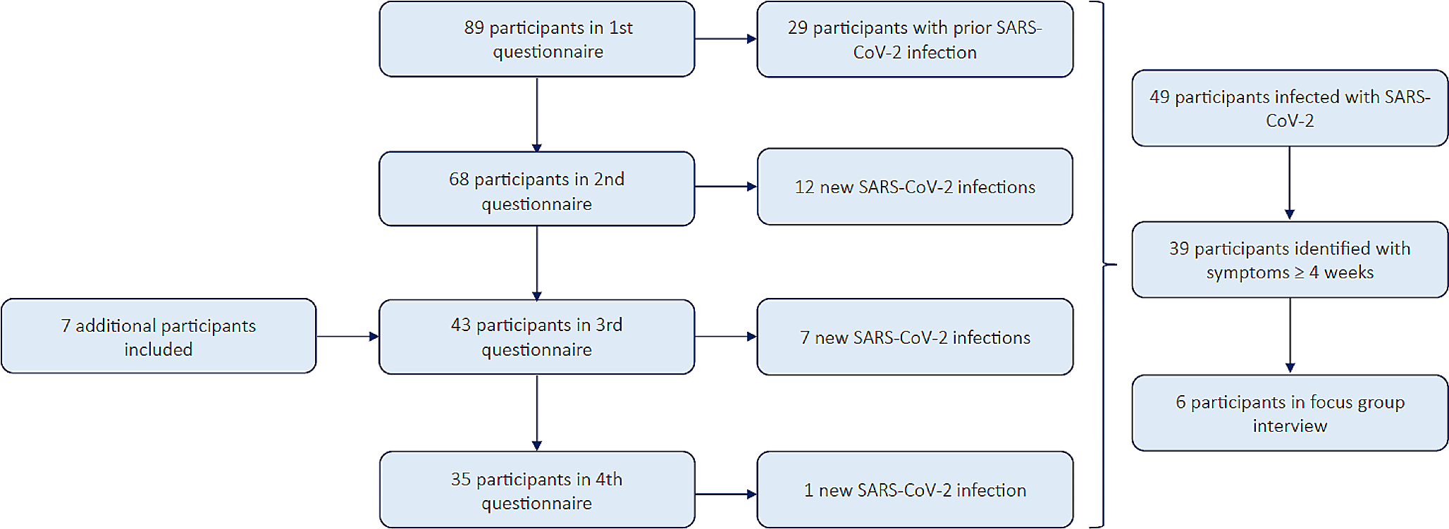 After completing each questionnaire, long COVID was identified when a patient developed new symptoms during or after SARS-CoV-2 infection, that cannot be explained by alternative causes and persisted longer than four weeks. This was checked with medical chart review.