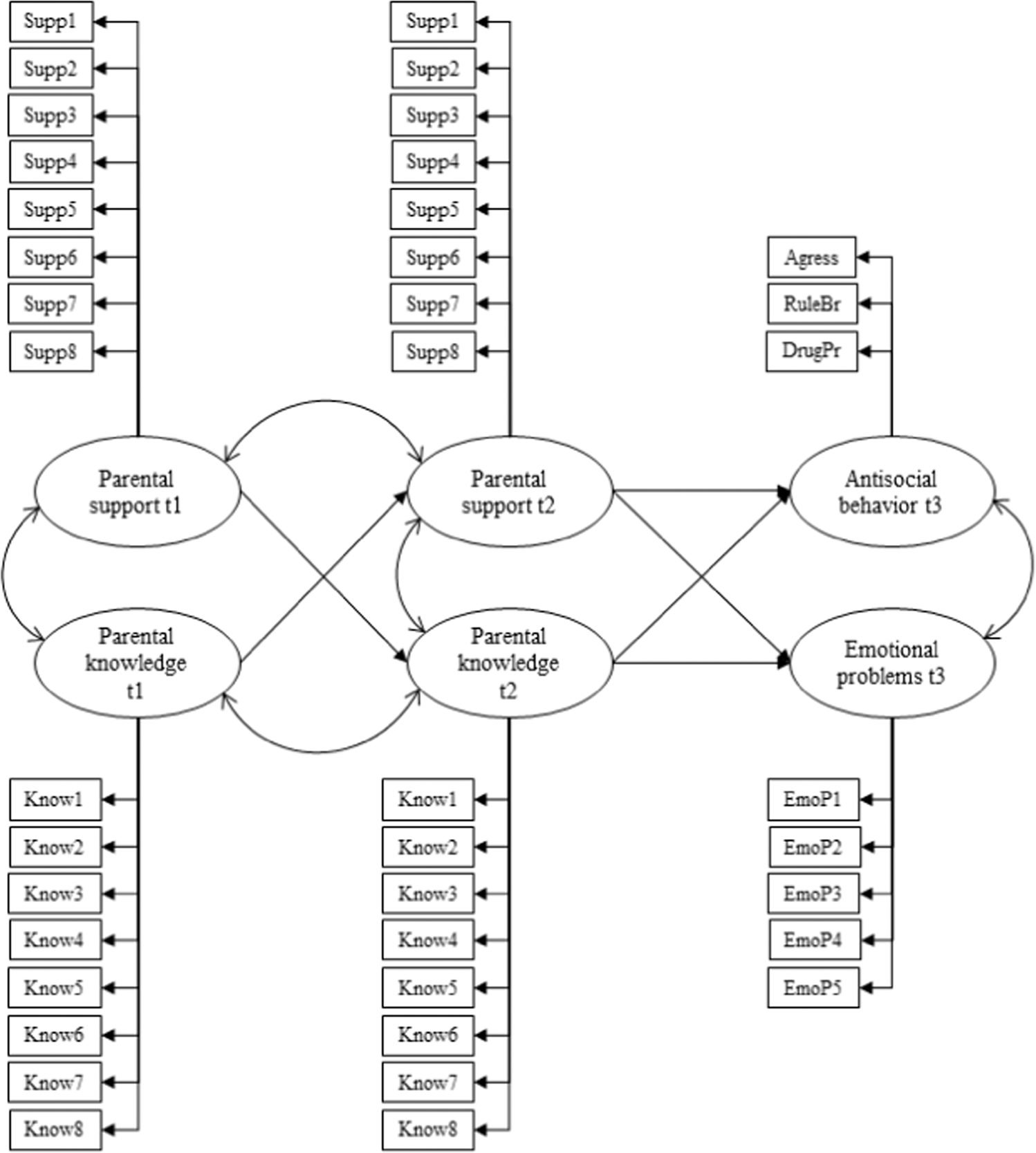 To address these gaps, the current study analyzed bi-directional relationships and longitudinal mediation effects of parental support and parental knowledge on both antisocial behavior (externalizing problems) and emotional problems (internalizing problems) in Spanish normative adolescents. In addition, cross-sectional and longitudinal relationships between externalizing and internalizing problems were analyzed in order to shed further light on patterns of adjustment problems displayed by youth at this developmental stage. Although antisocial behavior did not predict emotional problems and emotional problems did not predict antisocial behavior two years later, antisocial behavior and emotional problems were significantly and positively correlated in T1 as well as in T3. These results confirm the co-occurrence of both externalizing and internalizing problems in adolescence (Loeber & Burke, 2011) and highlight the need to adapt prevention and intervention strategies accordingly (Ballester et al., 2020).