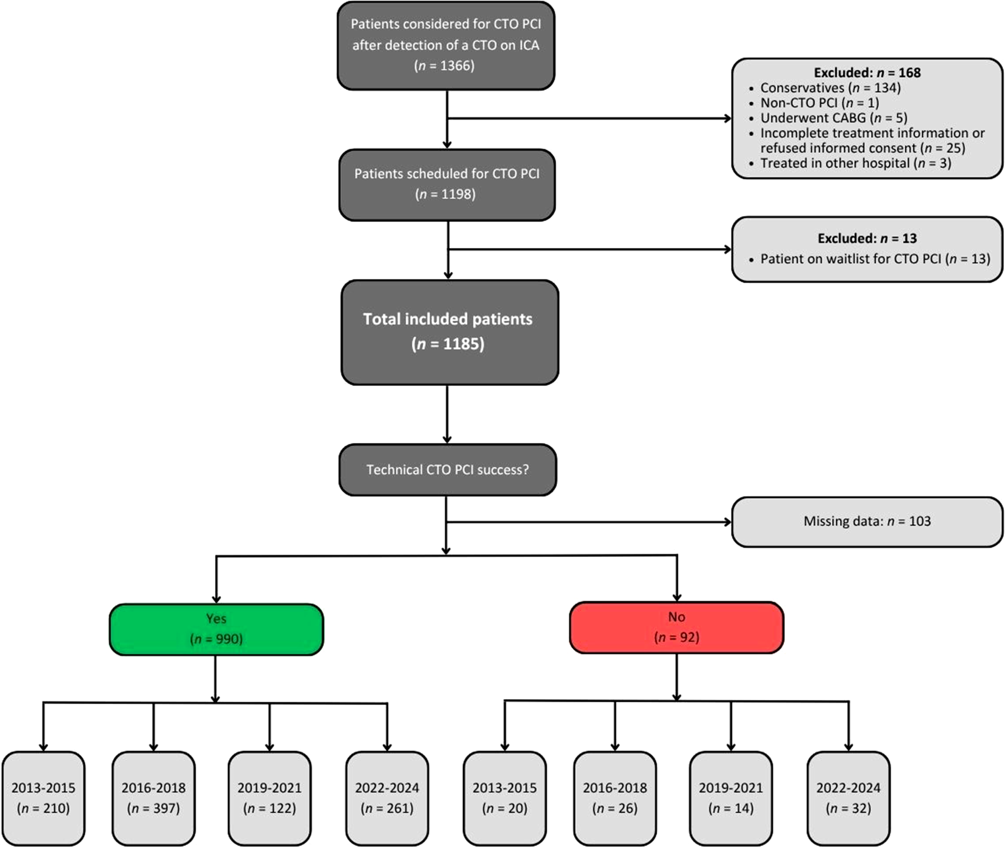 A total of 1366 patients were considered for CTO PCI after detection of a CTO on ICA (Fig. 1). Of this cohort, 181 patients were excluded due to: conservative treatment (n = 134), non-CTO PCI performed (n = 1), revascularization through CABG (n = 5), incomplete treatment information or no written informed consent (n = 25), treatment performed elsewhere (n = 3), or patient on the waitlist for CTO PCI (n = 13). The remaining 1185 patients were stratified according to the four predefined periods. The baseline characteristics are depicted in the Electronic Supplemental Material (ESM) Tab. S1. Age, BMI, and sex distribution were consistent across all time intervals. Hypertension, hypercholesterolemia, and family history of coronary artery disease demonstrated a higher prevalence in time period [c] and [d], whereas renal insufficiency showed a lower prevalence in time period [c] and [d]. The majority of patients in this cohort had a cardiac history of prior MI (54%) and prior PCI (60%).
