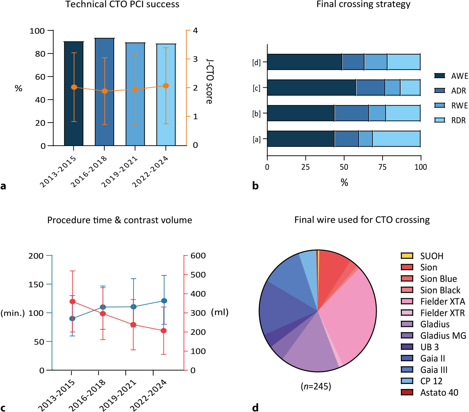 Procedural outcomes. a Technical CTO PCI success rates are constant, with an average Japanese CTO score (orange line) of 2 ± 1 across all time periods. b The most frequent final crossing strategy was AWE, followed by RDR. In time period (c), ADR was the second most used crossing strategy. c Total procedure time (blue line) showed a temporal increase, whereas total contrast volume (red line) decreased over time. d For 245 patients (21% of the total cohort), the final wire used to cross the CTO lesion was captured in the electronic patient dossier. The most frequently used wires were the Fielder XTA (30%), Gladius (16%), and Gaia II (15%), respectively