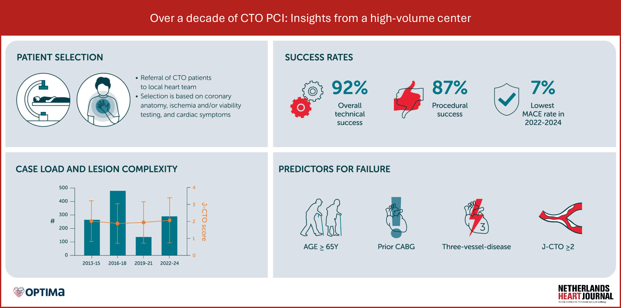 Infographic. We report the longitudinal (> 10 years) results following the introduction of a dedicated CTO program in Amsterdam University Medical Center. We found high and consistent technical CTO PCI success and procedural success rates (92 and 87% in the total cohort). The observed in-hospital MACE rate improved from 13% (in 2013–2015) to 7% (in 2021–2024). In this cohort, important predictors for technical failure were age ≥ 65 years, prior CABG, mildly impaired LVEF, prior CABG, three-vessel disease, and an intermediate to high J‑CTO score (≥ 2)