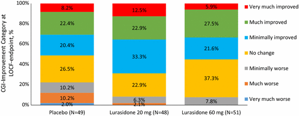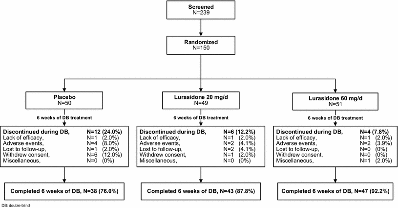 The 6-week treatment completion rates were 76 % for the placebo group, 88 % for the lurasidone 20 mg/day group, and 92 % for the lurasidone 60 mg/day group (Fig. 1).