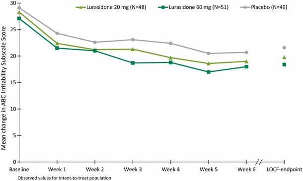 In this randomized, double-blind, fixed-dose (20, 60 mg/day), 6-week study, lurasidone did not significantly differentiate from placebo on the primary endpoint, change in the ABC Irritability subscale. Significantly greater improvement was observed at endpoint on the CGI-I scale for the lurasidone 20 mg/day group compared with the placebo group. However, no significant difference was observed for either dose of lurasidone compared with placebo on other secondary efficacy measures at either dose.