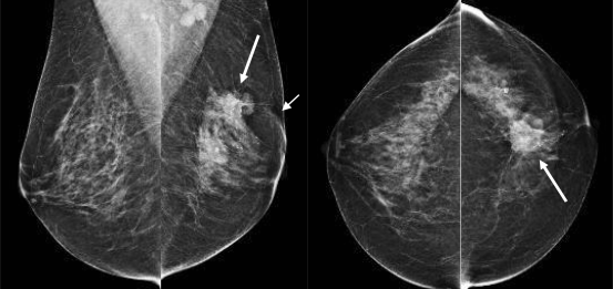 Gespiculeerde irregulaire massa centraal boven in de linkermamma (grote pijlen) met hierin calcificaties. Tevens huidintrekking (kleine pijl) en vergrote lymfklieren links axillair. BI-RADS 5 (pathologie: infiltrerend ductaal carcinoom).