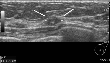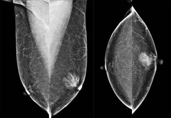 Onscherp begrensde irregulaire massa laterale onderkwadrant linkermamma (pijlen). Door de vorm en de begrenzing is de massa verdacht voor maligniteit, maar door de horizontale ligging is er evenveel kans dat het een veldje klierweefsel betreft, bijvoorbeeld met atypie. BI-RADS 4b, matige verdenking op maligniteit (pathologie: infiltrerend ductaal carcinoom).