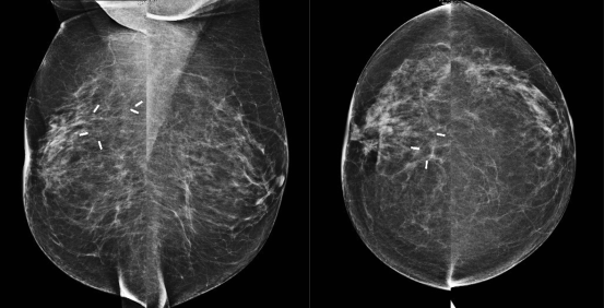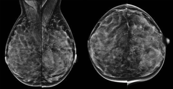 Standaardmammogram, MLO-opnamen en CC-opnamen van dense mammae.