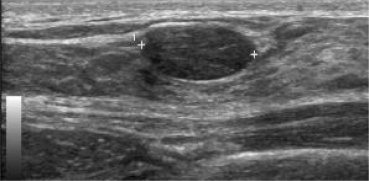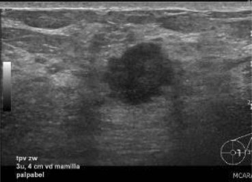 Echografische afbeelding van een scherp begrensde, ovale, parallelle massa in het mediale bovenkwadrant van de rechtermamma, passend bij een fibroadenoom. Ten tijde van het eerste onderzoek wordt hiervoor een BI-RADS 3 afgegeven. Als de massa na zes maanden onveranderd is gebleven, dan wordt de classificatie een BI-RADS 2 en is verdere controle niet meer nodig.