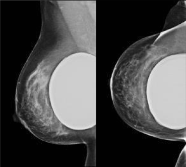 Mammografie rechts van een vrouw met een retroglandulaire mammaprothese. Dit mammogram kan als goed beoordeelbaar worden beschouwd en toont geen afwijkingen. In verband met de aanwezigheid van de prothese wordt dit mammogram verslagen als BI-RADS 2 (benigne).