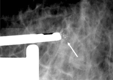 Opname van stereotactische benadering van gegroepeerde calcificaties (pijl) met de biopsienaald ter plaatse.
