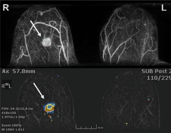 MRI mammae na contrast, uitgevoerd omdat patiënte neoadjuvante chemotherapie zal ondergaan. Axiale coupes met hierin een pathologisch aankleurende irregulaire massa centraal in de rechtermamma (pijlen) met hypertrofische bloedvaten. Deze tumor was al bekend van mammografie en echografie. BI-RADS 6, PA-bewezen maligniteit.