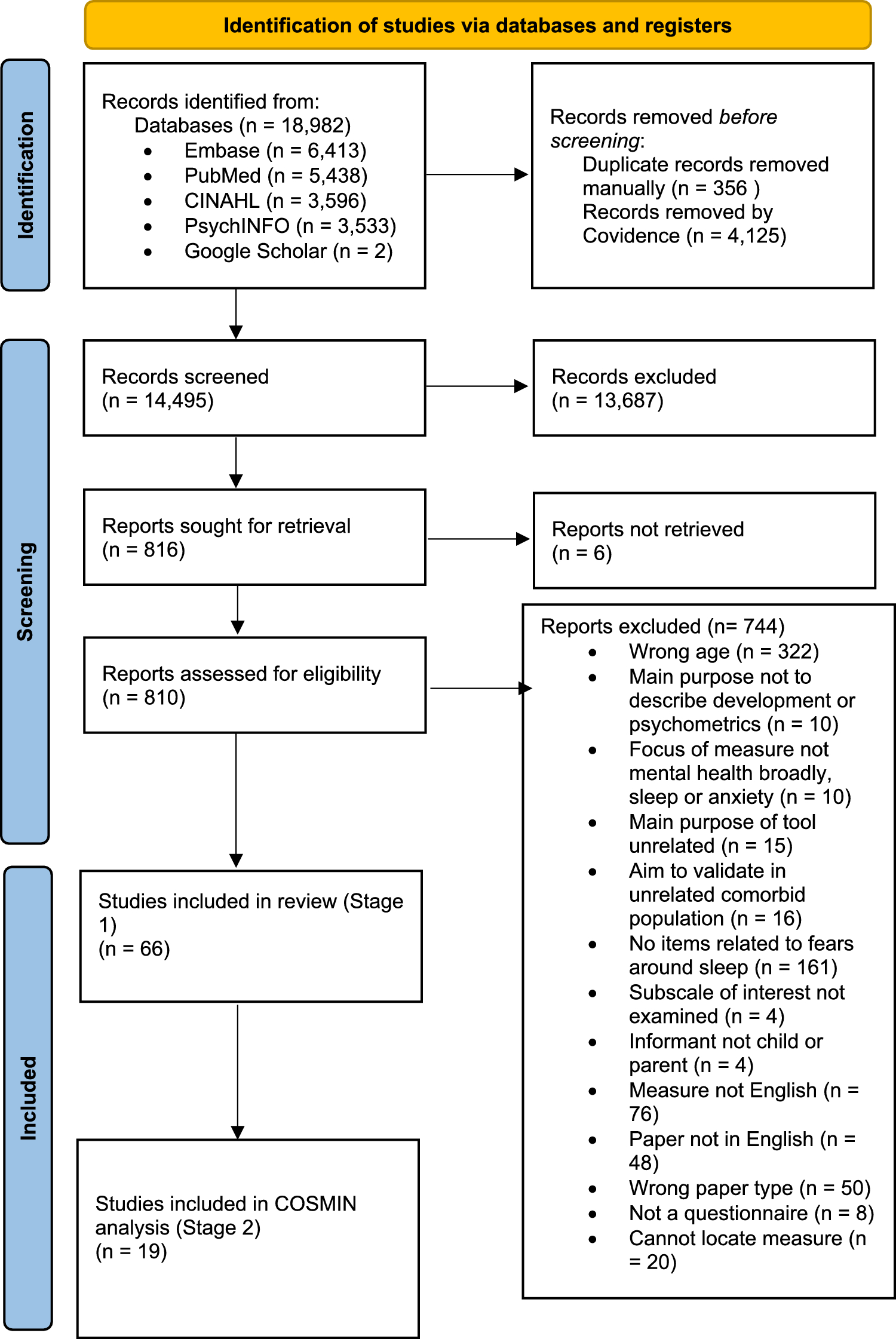 Studies were excluded if (1) the tool had the main purpose of measuring unrelated anxieties and phobias (e.g. social anxiety, panic disorder, obsessive–compulsive disorder), as they are unlikely to thoroughly explore fears related to sleep or sleep conditions other than sleep disturbances or insomnia; (2) the study population of interest was children with neurodevelopmental or medical comorbidities, e.g. autism, attention-deficit/hyperactivity disorder and epilepsy; (3) the measure was used in a medical or hospital setting; (4) the measure was in a language other than English; (5) they were not original research, i.e. reviews, books, meta-analyses, expert opinions, conference abstracts, case studies and dissertations and (6) the paper was in a language other than English. Measures in a language other than English were excluded due to the author’s proficiency being limited to English, as this review required examining item content in detail.