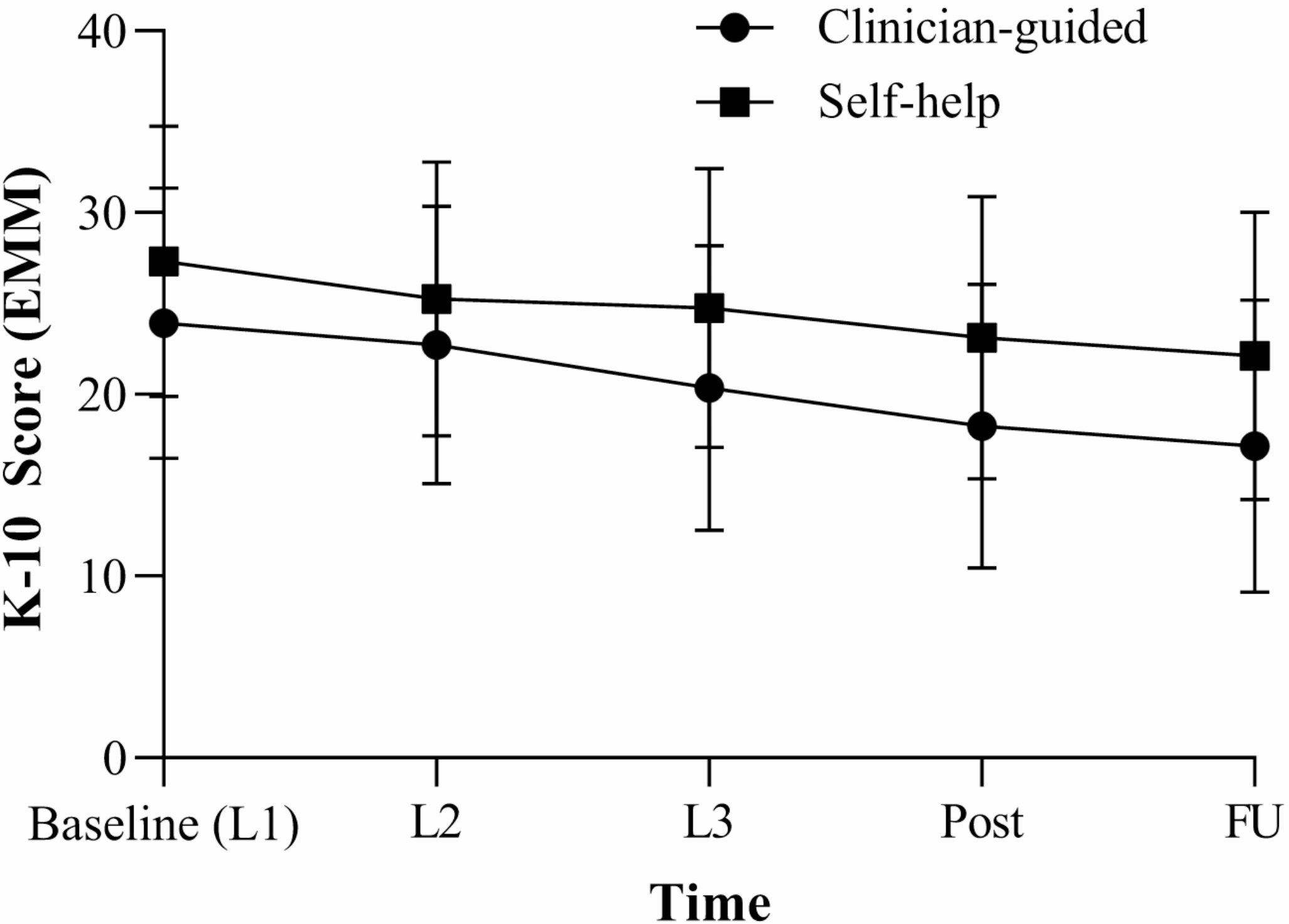 b) Changes in Distress across treatment. There was a significant effect of time (F(4, 287) = 34.29, p < 0.001) and group (F(1, 90) = 7.91, p = 0.006), but no time by group interaction (F(4, 287) = 1.65, p = 0.162), showing that distress (K-10 scores) reduced in both treatment groups (see Fig. 2, and Table 2 for results including within-group effect sizes and confidence intervals). Examining lesson-by-lesson scores on the K-10, both groups experienced small but mostly non-significant improvements in distress after each lesson, with within-group effect sizes ranging from 0.06 to 0.30. In the clinician-guided group, the only statistically significant reduction in distress occurred between Lesson 2 and 3 (p = 0.046). In the self-help group the largest reduction in distress occurred between Lesson 1 and 2, approaching statistical significance (mean difference = 2.05, p = 0.060; see Table 2). The same pattern of findings was observed in the covariate-adjusted analyses (see Table 3).