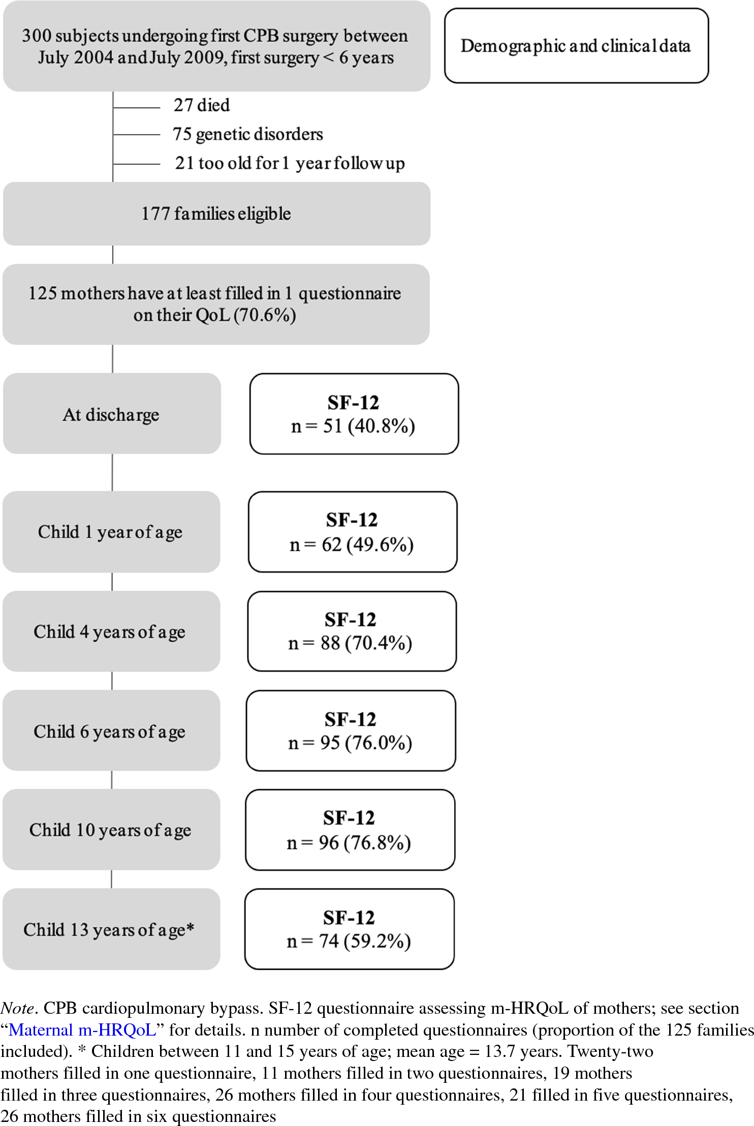 For the current analysis, families were included if their child underwent CPB surgery before the one-year assessment (conducted when the child was between 1 year 0 months and 1 year 11 months of age). Further, families were included if their child had no genetic or chromosomal disorder because these children were not assessed after 6 years of age. Therefore, of the 300 families initially included in the prospective cohort study, 177 families were eligible for the current analysis. Of these 177 families, 125 mothers completed a questionnaire about their own m-HRQoL at one or more measurement timepoints and were included in this analysis. The detailed recruitment procedure is displayed in Fig. 1.