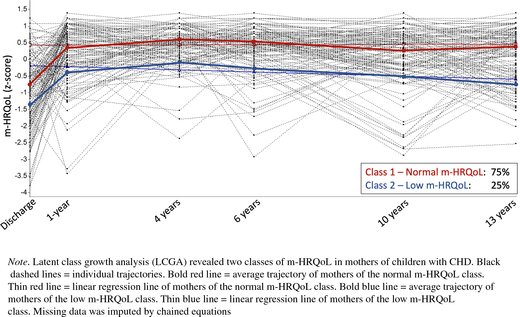 In this study, we investigated trajectories of psychological dimensions of HRQoL (i.e., mental HRQoL [m-HRQoL]) in mothers of children with CHD from hospital discharge after the first open-heart surgery until the children were 13 years of age. We further aimed to identify classes of maternal m-HRQoL trajectories and risk factors for low m-HRQoL over time.