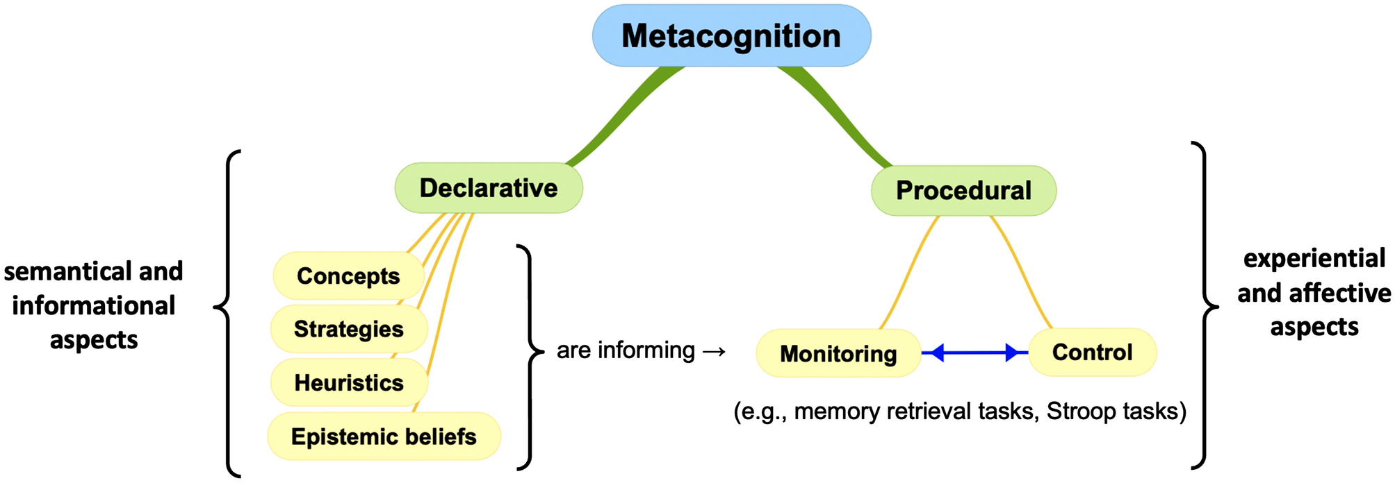 The two facets of metacognition: the declarative facet revolves around the long-term knowledge we have on how cognition functions and is semantically based; the procedural facet revolves around the tracking and manipulation of cognition and is experienced based (e.g., memory retrieval tasks, Stroop tasks)