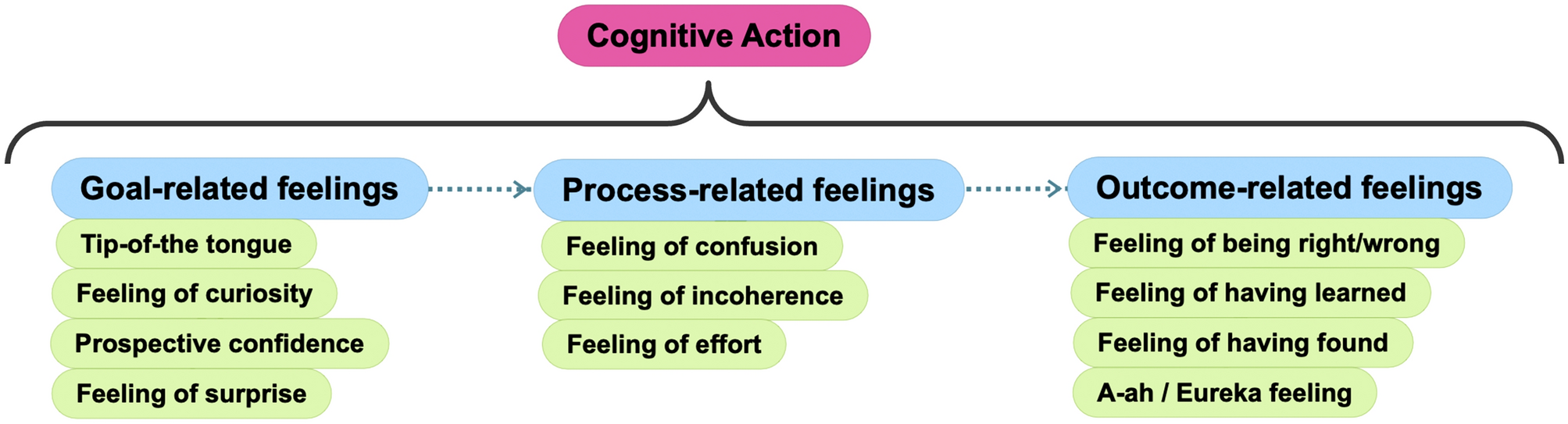In this article, the term “metacognitive feelings” is used to account for feelings related to epistemic states and cognitive tasks (Goupil & Proust, 2023). These feelings are implicated in the modulation and manipulation of cognitions and are expressed as a function of the monitoring and control processes. Representative examples of such feelings include a tip-of-the-tongue (TOT) feeling, a feeling of curiosity, a feeling of confusion, a feeling of effort, a feeling of having learned, a feeling of being wrong, a feeling of having found, and an “Aha!”/ “Eureka!” feeling (Danek & Wiley, 2017), which have been considered metacognitive feelings of epistemic gain (Sooter et al., 2024). Such feelings, which have been the focus of extensive research in the last decades, are triggered during the learning process itself (Arango-Muñoz, 2019). From a cognitive science perspective, within a metacognition framework, reasoning is postulated as being essentially guided by metacognitive feelings (Proust, 2010). The procedural functions of monitoring and control play a pivotal role in cognitive actions, which are typically characterized by a tripartite structure: the conception of a hypothesis, the subsequent verification process, and the appraisal of the resulting outcomes (Goupil & Proust, 2023). At each stage in this sequence, metacognitive feelings play a noteworthy role, as they provide the individual with critical feedback that contributes to optimizing cognitive conscious and unconscious regulation. Figure 2 depicts a cognitive action through the steps of goal-related, process-related, and outcome-related metacognitive feelings, which is based on the framework proposed by Goupil and Proust (2023).