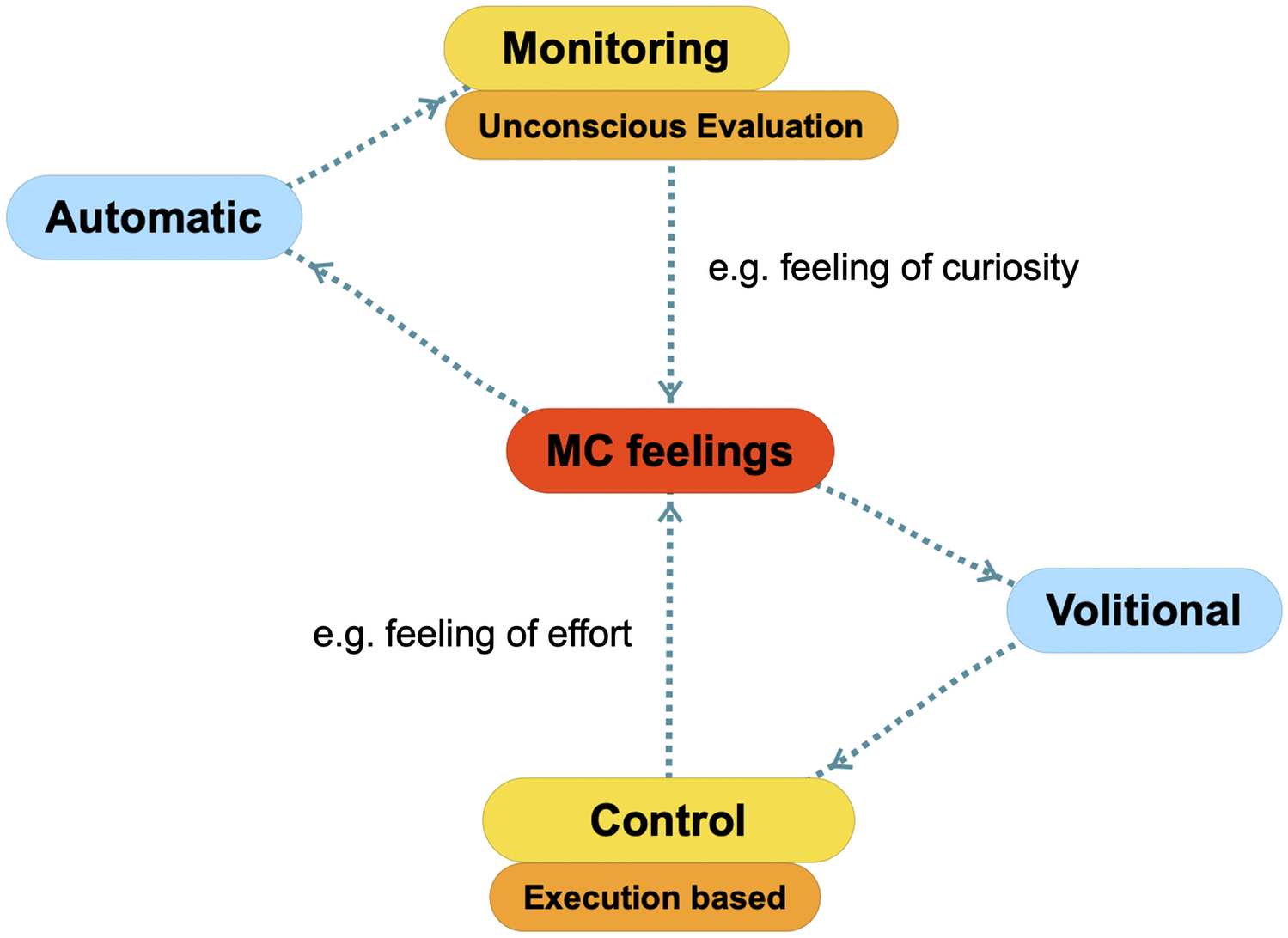 Metacognitive feelings hence possess a unique function in the differentiation between an overt, controlled manner of functioning and a covert, automatic one. They are inherently unconscious regarding their origin, yet are overt in both their experiential subjective aspects and outcomes. They serve within the meta-awareness process of the individual as a bridge that facilitates the shift from an unconscious, unregulated mode of operation to a conscious, regulated one, serving as the foundation for controlled action (Koriat, 2000) as pictured in Fig. 3.
