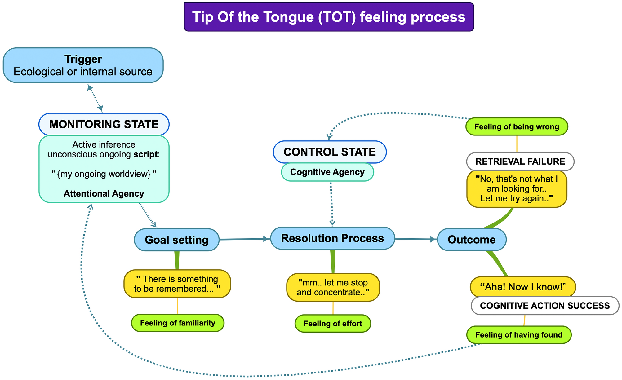 In this example, if instead the correct name is proposed, the correctness of the name creates an “Aha!”/“Eureka!” experience, a feeling related to discovering the correct solution, a feeling of “being right,” of “having found.” In that case, the control of cognition stops and leaves space for a positive emotional experience triggered by the successful completion of the task. In this regard, the TOT feeling constitutes a metacognition-related process that triggers the three components of cognitive action: setting a goal, controlling cognitive effort, and monitoring the outcome (Goupil & Proust, 2023) as depicted in Fig. 4.